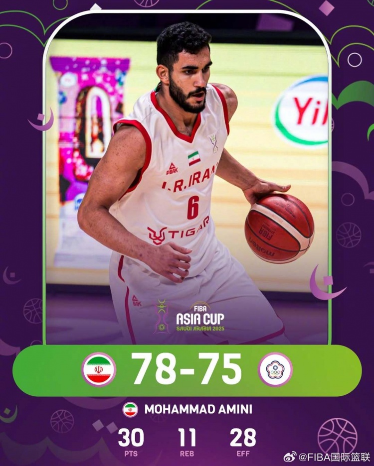 此役,伊朗球员阿米尼首发出战33分钟,投篮19中10,三分5中2,罚球12中8,砍下30分11板大号两双,另有2助1帽。