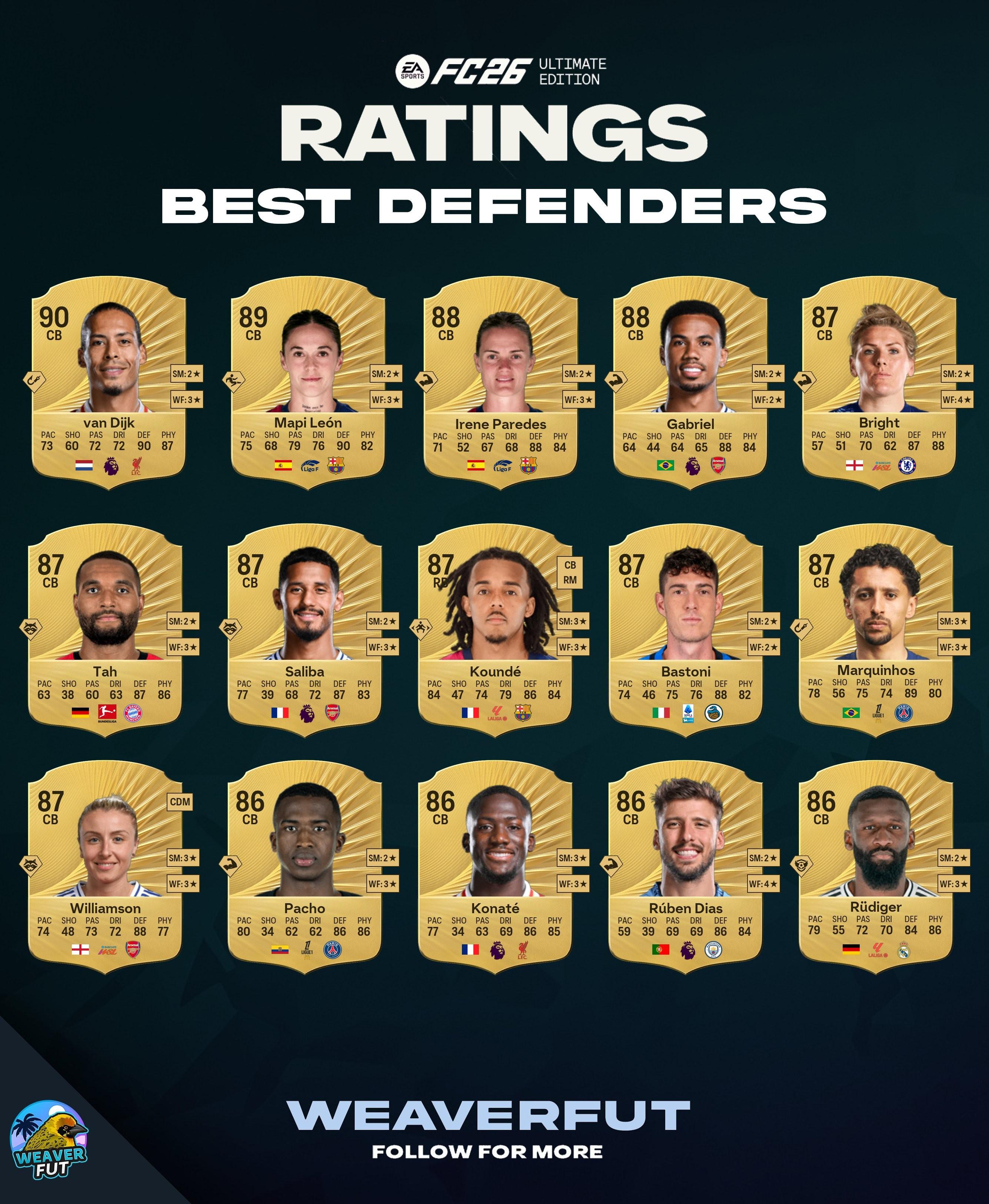 《FC26》中卫前15名遭到了曝光,其中,范戴克第一、加布里埃尔第二、塔和萨利巴在列。